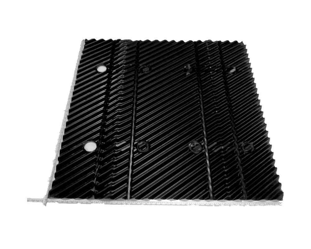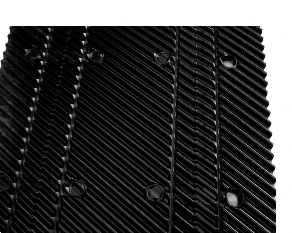 冷卻塔塔芯填料是由優(yōu)質(zhì)PVC聚乙烯片正負壓及吸塑而成,主要采用了水紋波形、梯形波、點波形、S波型、人字波形填料,散熱面積增長系數(shù)大,水流在板面上分布性能好,水和空氣流經(jīng)板面時擾動大等優(yōu)點。填料不易變形,耐高溫,抗老化,且阻燃性能好,風阻系數(shù)小。安裝方便,易清洗,運輸方便該散熱填料采用粘接式及懸掛式,安裝簡便,便于清洗,且成功解決了粘接填料因吸積垢、自重而產(chǎn)生變形,且變形后積垢更加嚴重、難于清洗的問題。填料阻燃性能好,阻燃氧指數(shù)指標為42.7,每立方米組裝體質(zhì)量約為15 kg—30kg/m3,組裝高度為0.5m—3.0m,交錯布置,對于塔壁周邊異形塊可視現(xiàn)場布置情況,按實際尺寸切割、安裝。