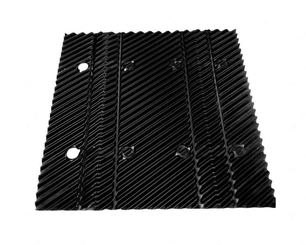 一、性能好,冷卻效率高填料為薄膜式,突起的細波紋使水接觸面更大。填料分1-2-3-4-5層放置,層與層之間均有一次熱水的再分布過程。 二、親水性好、通風阻力小表面呈現(xiàn)粗糙、較光滑平面的填料親水性好,吸水率小于0.015%,使更多的水流形成薄膜,而不濺落,使水和空氣更充分地接觸同時使水與空氣在流動時表面擾動大。填料組裝后入風面是呈蜂窩狀的導流器,有良好的均布風效果,提高并穩(wěn)定了水氣的熱交換強度。入風端傾斜5.5°角,有效地降低了漂水損失。在填料末端設(shè)置有按撞擊分離法設(shè)計的收水器,使漂水損失有效控制在十萬分之一以內(nèi)。
